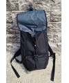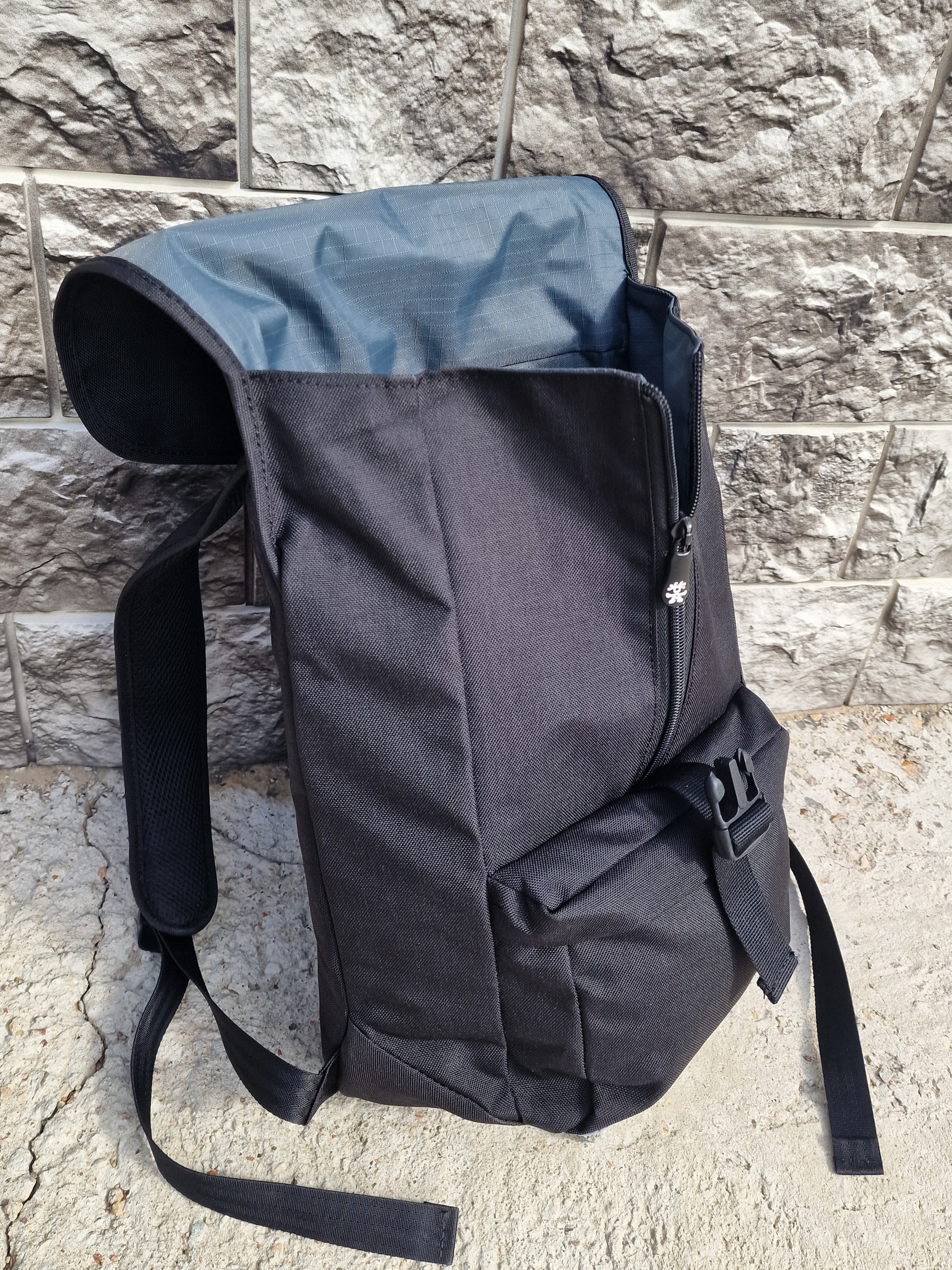 Основной отдел с внутренними карманами на застежке-молнии, расходящейся посередине рюкзака и закрывающийся сверху крышкой с застежкой-фиксатором типа фастекс. Отдел на застежке-липучке в задней части внутри рюкзака для ноутбука или документов формата А4. Небольшой карман снаружи в нижней части рюкзака на застежке-молнии. Рюкзак из плотной холщовой ткани с контрастными полосками, подчеркивающими индивидуальность хозяина.